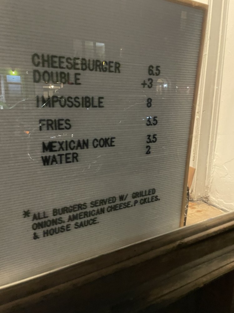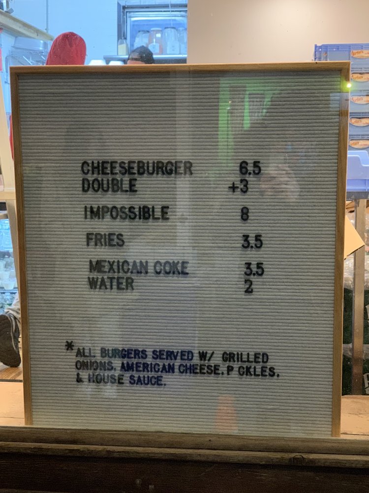 Impossible patty flat top grilled with onions, American cheese, pickles and house sauce
