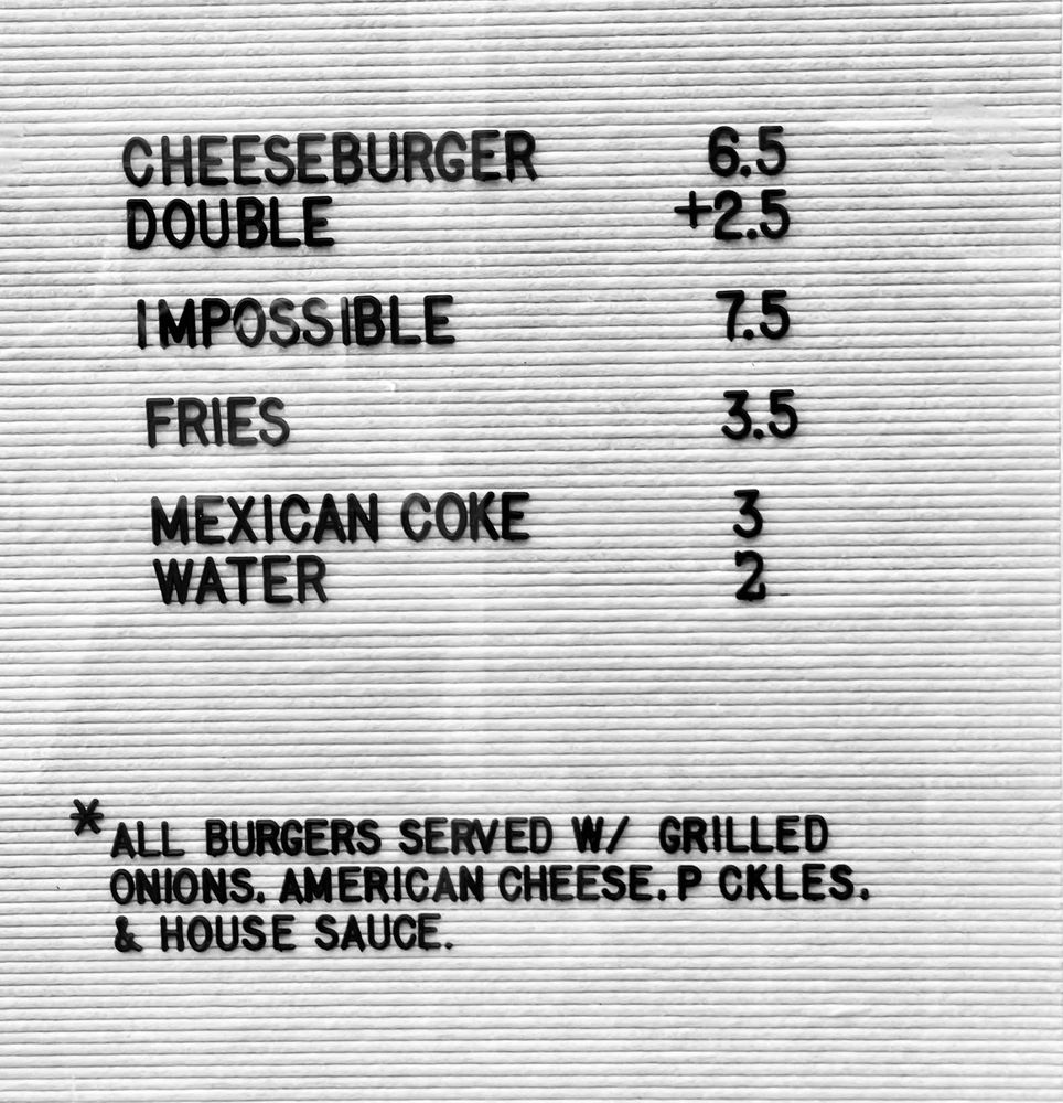 Two Impossible patties flat top grilled with onions, American cheese, pickles and house sauce